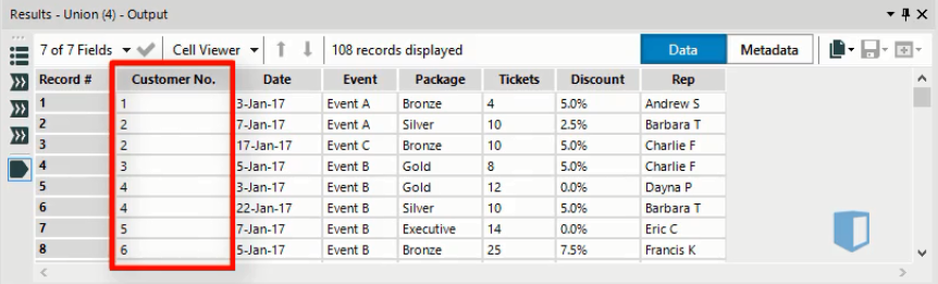 Let's look at an example of joining in Alteryx. Below is a sales dataset which shows sales of corporate event packages. Note that one of the columns is called Customer Number. This column indicates the customer that this particular sale was made to.