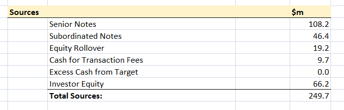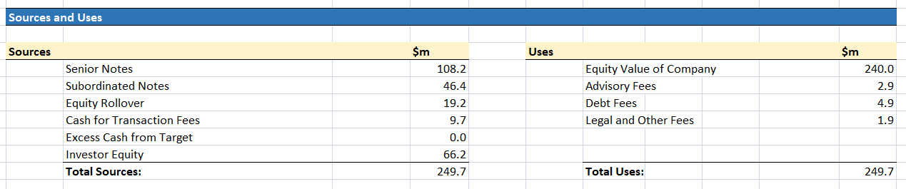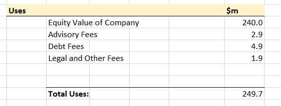 As you can see in the example above, the total source and the total uses should balance. Here both figures are equal to $249.7 million. This ensures that all the sources of funding for the transaction will be used, and ensures that funding sources are available for all the funding uses in the transaction.