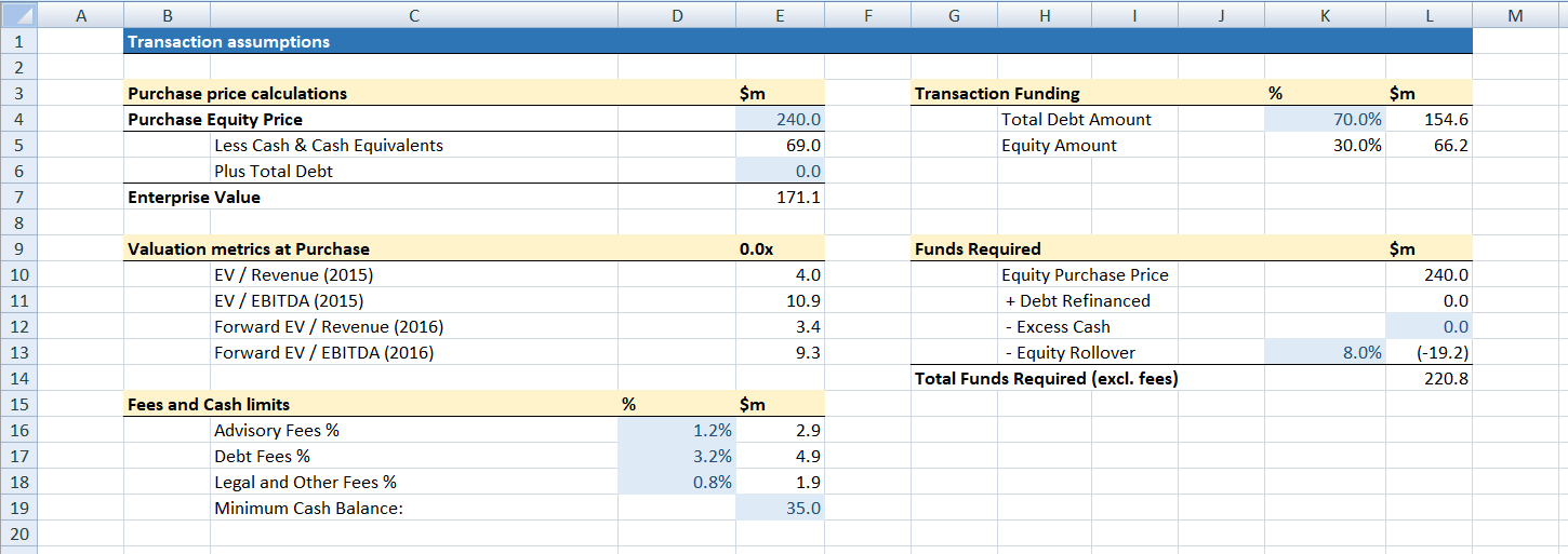 - Excess Cash from Target: The transaction may be partly funded by excess cash held by the business. This figure can be found in the transaction assumptions section.
