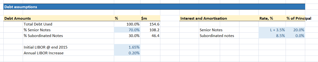 - Subordinated Notes: These are unsecured debt, used to make up the balance of the debt required to fund the transaction. This figure is also obtained from the debt assumptions.